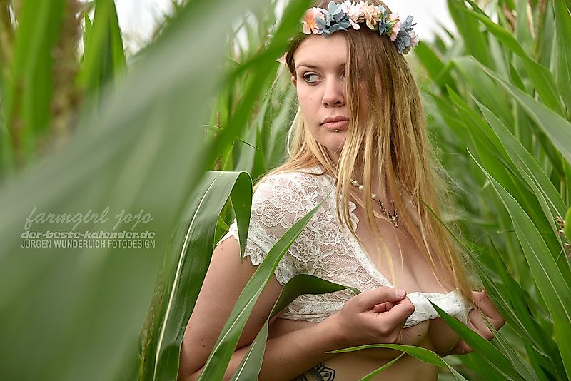 When we plan our photo shoots, we usually have a basic idea! - So we go into the cornfield with the dirndl. Then I stand there in the cornfield and start posing - nice soft light, the warm air, sunbeams and the beautiful lush green of the corn plants motivate me - as soon as we have finished the beautiful pictures in the dirndl I start to slowly take off the dirndl - admittedly the dirndl pictures in the corn are really beautiful but even more beautiful are the pictures where I stand naked in the corn... the naked body between the corn plants just looks great... I hope you agree with me - your JoJo