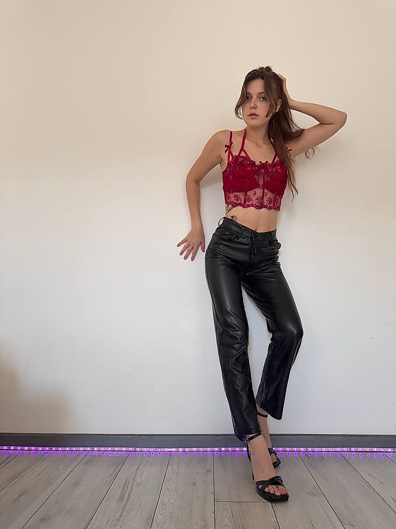 "Red as fire, black as night – my outfit combines passion and strength. The top glows with intensity, while the leather pants exude both power and sensuality. A look that doesn't do things by halves."