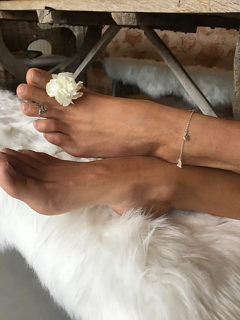 Después de un baño de pies en la piscina, me encantaría relajarme sobre la alfombra de piel de oveja. ¿Quién me mimará los pies?