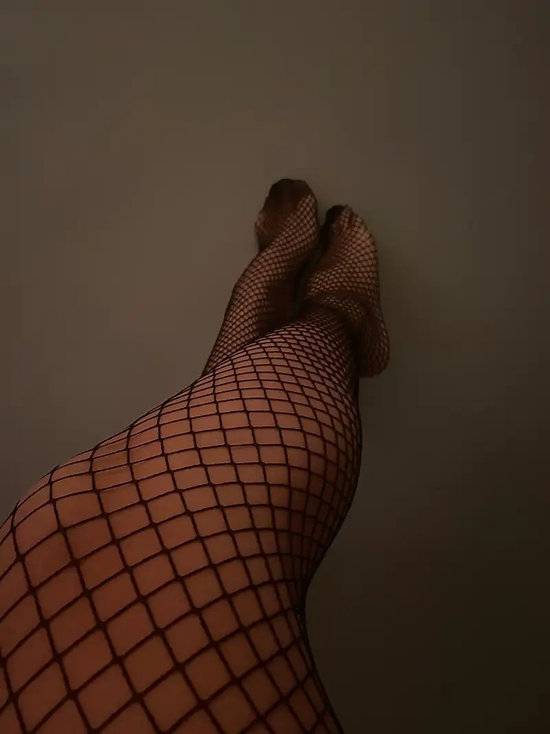 Probándome mis medias negras de rejilla con encaje, muy sexys.
