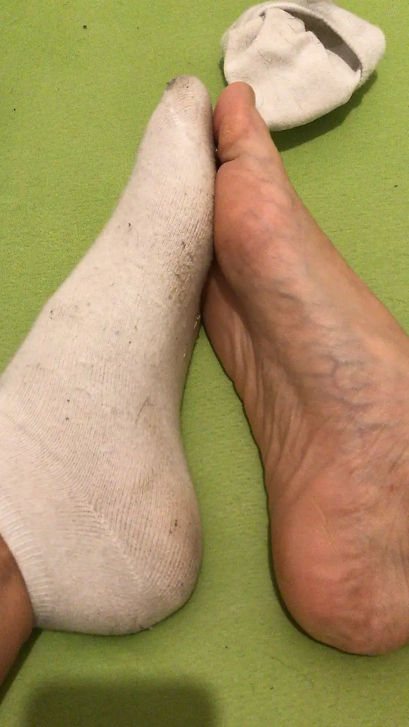 Estoy descansando en la cama en top y bragas y te enseño mis calcetines blancos gastados ;)