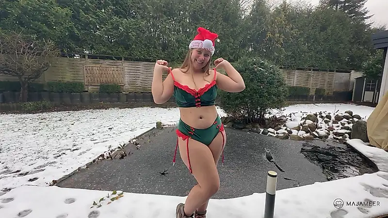Estoy frente a ti en la nieve que se derrite suavemente. Mi lencería verde y roja se ajusta a mi cuerpo, mi gorro de Papá Noel me sienta perfecto. Antes de concederte un deseo, tomo un pequeño trozo de hielo y lo acaricio lentamente sobre mis pezones... se endurecen al instante, y puedo ver exactamente cómo te excita. Luego me inclino hacia adelante y empiezo a hacerte una mamada profunda, cálida y apasionada, hasta que me agarras y me aprieto contra ti en posición de perrito. Seré tu pequeña ayudante navideña hasta que te corras por completo 😏✨