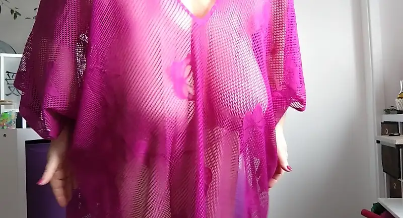 Vestida solo con un poncho de malla morado, sin nada debajo. Te mostraré mi frente y mi gran trasero, que estoy golpeando contra mis nalgas. Estoy dejando que mis grandes tetas, pezones y voluptuosas curvas se vean a través de la tela. Colgada en la red de la pelota saltarina, mis tetas se balancean y se mueven de un lado a otro.