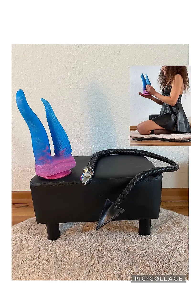 Claro, primero tengo que sacar el tapón del diablo de mi culo, si no, no podré meterme la "cosita doble". Con mi vestido sexy (efecto mojado), estoy probando mi nuevo juguete. A ver si los tentáculos penetran profundamente dentro de mí. Lo estoy montando, me ves desde atrás y desde delante, y por supuesto, ¡mi cara también! ;-) !