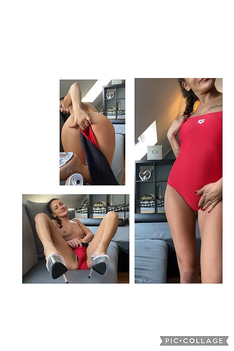 La siguiente misión de Arena, haciendo honor al nombre ;-) …… Con tacones de plataforma transparentes, follo el traje de baño de Arena mojado, empapado y sudoroso, incluso me corrí varias veces por la "buena pieza" (incluso en el traje de baño) 10 min