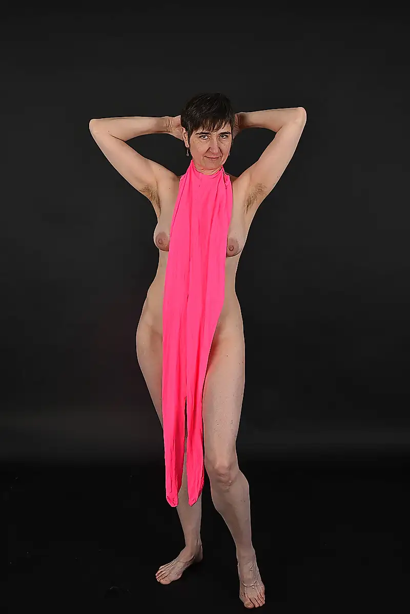 Striptease într-un studio foto purtând un costum roz. Ei bine, există diferite moduri de a purta așa ceva.
